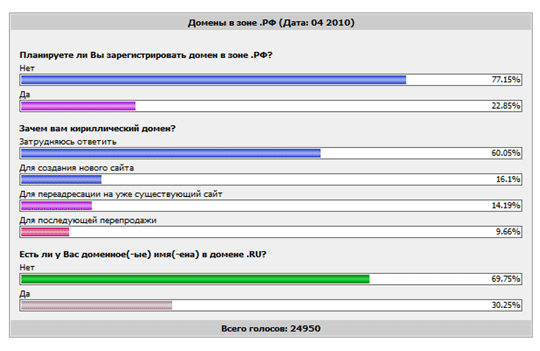 Commissioned by the Coordination Center for ccTLD .RU, from 5 through 11 April 3DNews company was running a custom-made survey on its web site on the subject of “Registration of domain name in zone .РФ”. As many as 5,750 (22.85%) out of a total of nearly 25,000 respondents gave a positive answer to the question “Are you going to register domain name in zone .РФ?”