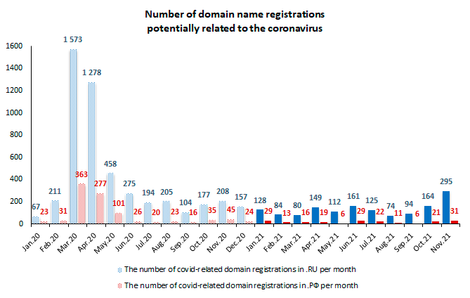 In total, 1,669 domains containing words corona, covid, pandemic, pandemia, vaccine, ковид, пандемия, and вакцина among others have been added to the list since the beginning of 2021 (January-November): 1,466 in .RU and 203 in .РФ.