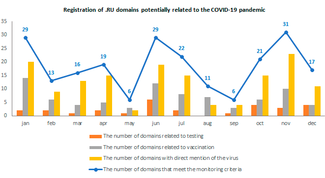 Over the previous year, owners registered 1,591 domains containing the words corona, covid, pandemia, ковид, пандемия, вакцина and the like in .RU and 203 in .РФ; the total number of such registrations in 2021 was 1,669 in both Russian domain zones.
