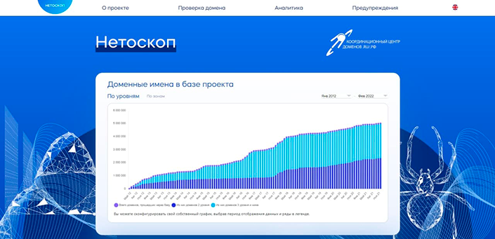 The new website of the Coordination Center for TLD .RU/.РФ project ‘Netoscope’ was launched on February 1st. This is more simple, understandable and user-friendly version where you can find out interactive charts and check the number of domain names that have passed through the project database. You can also filter them by category and look through the dynamics of changes in the number of ‘malware’ for the selected period as well as check any .RU, .РФ or .SU domain that seems to be suspicious. If the domain name is already in the Netoscope database, the user will see a notification about this, otherwise, the user will be prompted to report about suspicious resource through the cybersecurity experts Hotlines on the Domain Patrol website. The selected competent organization will make a conclusion on the harmfulness of the resource.