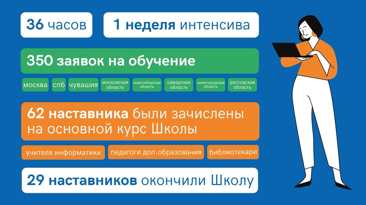62 applicants passed the preliminary selection by completing a test task and were enrolled in the main course of the School - mostly computer science teachers, librarians and additional education teachers.