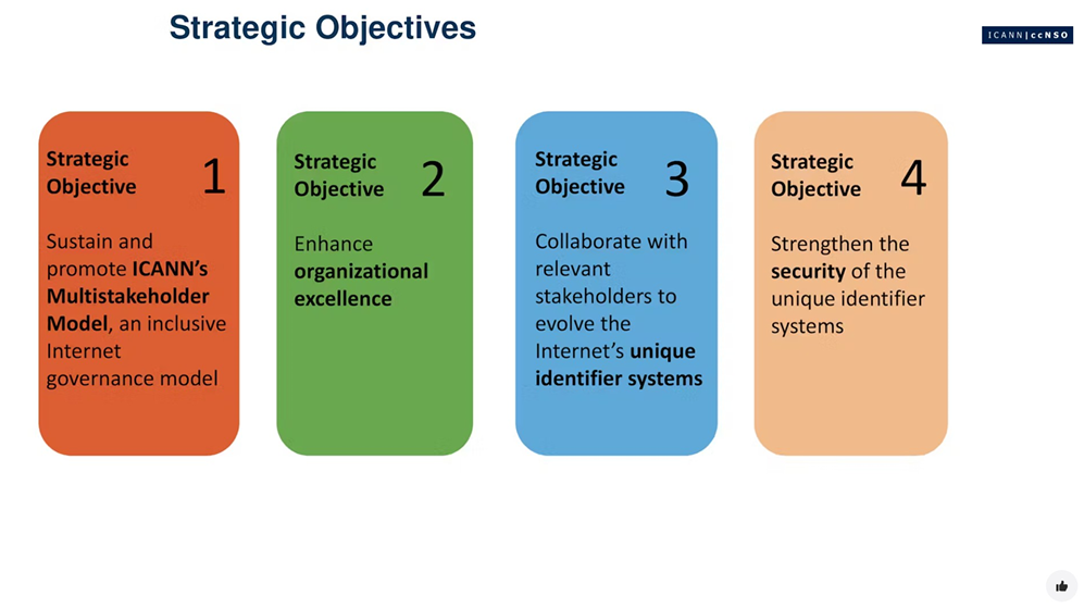 Член Правления ICANN Маартен Боттеман (Maarten Botterman) представил проект видения ICANN стратегических целей на 2026-2030 годы, среди которых: поддержка и продвижение модели с участием многих заинтересованных сторон ICANN, инклюзивной модели управления интернетом, повышение организационного совершенства, сотрудничество с соответствующими заинтересованными сторонами для развития систем уникальных идентификаторов интернета, а также усиление безопасности систем уникальных идентификаторов.