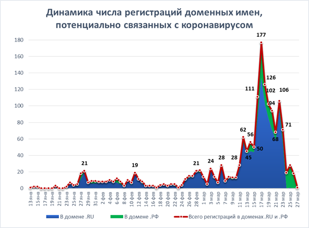 Эта тенденция заметна и в России. Так, в период с 1 января по 27 марта 2020 года в домене .RU было зарегистрировано 1310, а в домене .РФ 324 доменных имени, в которых встречаются слова corona, covid, virus, корона, ковид, вирус. Всего таких имен в российских национальных доменах на сегодня насчитывается 1634.
