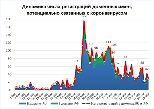 Таким образом, по данным на 28 апреля 2020 года в .RU зарегистрировано 3015 «коронадоменов», в .РФ – 677; в общей сложности в российских национальных доменах насчитывается 3692 доменных имени, связанных с пандемией.