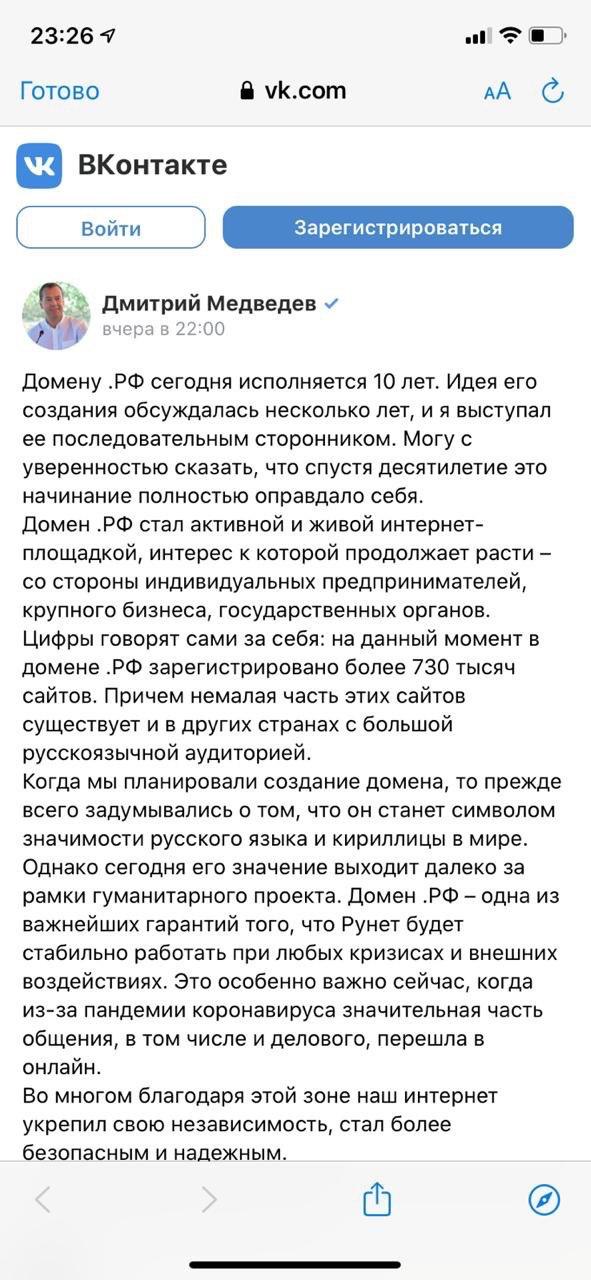 О том, как 10 лет назад на свет появился домен .РФ, на своей странице в социальной сети ВКонтакте рассказал один из самых главных его «родителей» - Заместитель председателя Совета Безопасности Российской Федерации Дмитрий Медведев, который в 2008-2012 годах занимал пост Президента РФ: «Когда мы планировали создание домена, то прежде всего задумывались о том, что он станет символом значимости русского языка и кириллицы в мире. Однако сегодня его значение выходит далеко за рамки гуманитарного проекта. Домен .РФ – одна из важнейших гарантий того, что Рунет будет стабильно работать при любых кризисах и внешних воздействиях. Это особенно важно сейчас, когда из-за пандемии коронавируса значительная часть общения, в том числе и делового, перешла в онлайн. Во многом благодаря этой зоне наш интернет укрепил свою независимость, стал более безопасным и надежным. Будем и дальше продолжать развитие крупнейшего кириллического домена мира».