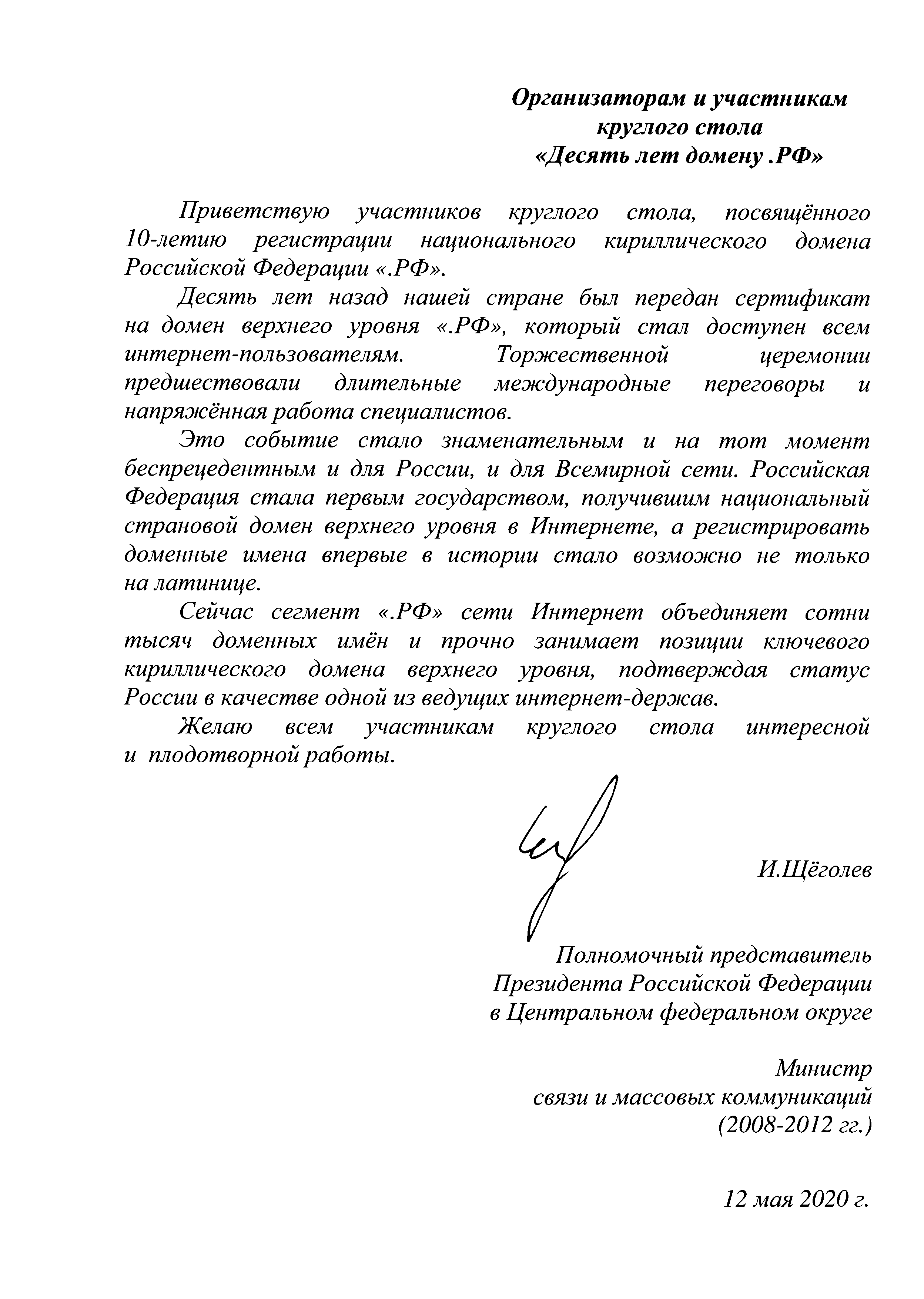 Приветствие участникам круглого стола направил Чрезвычайный и полномочный представитель Президента РФ в ЦФО, Министр связи РФ в 2008-2012 годах Игорь Щеголев. «Десять лет назад нашей стране был передан сертификат на домен верхнего уровня .РФ, который стал доступен всем интернет-пользователям. Торжественной церемонии предшествовали длительные международные переговоры и напряженная работа специалистов. Это событие стало знаменательным и на тот момент беспрецедентным и для России, и для Всемирной сети… Сейчас сегмент .РФ сети Интернет объединяет сотни тысяч доменных имен и прочно занимает позиции ключевого кириллического домена верхнего уровня, подтверждая статус России в качестве одной из ведущих интернет-держав», – написал Игорь Щеголев.
