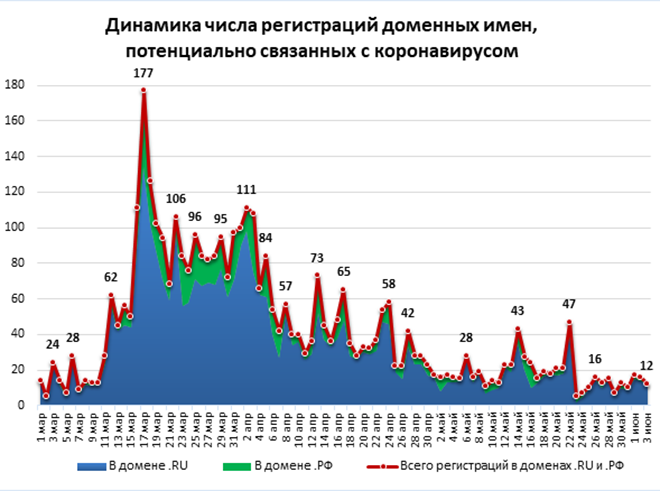 За весь период наблюдения (с января по июнь 2020 года) в список доменов, содержащих слова «сorona», «covid», «pandemia», «корона», «ковид», «пандемия» и другие, было добавлено 3554 доменных имени в .RU и 793 в .РФ; в общей сложности в российских национальных доменах насчитывается 4347 «коронадоменов».