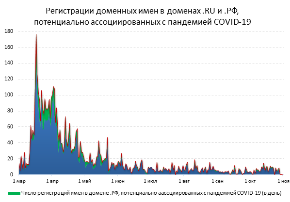 За весь период наблюдений (с января по октябрь 2020 года) в список доменных имен, содержащих слова «сorona», «covid», «pandemia», «ковид», «пандемия», «вакцина» и другие, было добавлено 4445 доменов в .RU и 906 в .РФ; в общей сложности в российских доменных зонах насчитывается 5351 «коронадомен».