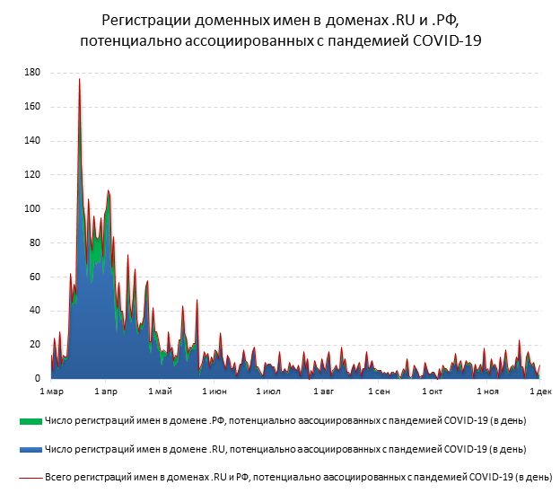 За весь период наблюдений (с января по ноябрь 2020 года) в список доменных имен, содержащих слова «сorona», «covid», «pandemia», «ковид», «пандемия», «вакцина» и другие, было добавлено 4676 доменов в .RU и 955 в .РФ; в общей сложности в российских доменных зонах насчитывается 5631 «коронадомен».