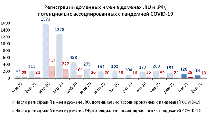 За весь период наблюдения с января 2020 года в список доменных имен, содержащих слова «сorona», «covid», «pandemia», «ковид», «пандемия», «вакцина» и другие, было добавлено 6145 доменов: 5119 в .RU и 1026 в .РФ.