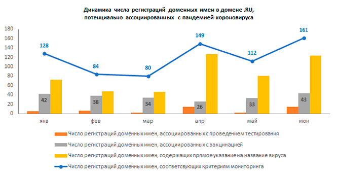 Количество «коронавирусных» доменов, зарегистрированных в июне, по сравнению с маем увеличилось почти в полтора раза. Если в мае было зарегистрировано 118 таких имен – 112 в .RU и 6 в .РФ, то в июне было зарегистрировано 190 доменов, связанных с COVID-19, из них 161 в .RU и 29 в .РФ. Пока что это самый высокий результат с начала 2021 года.
