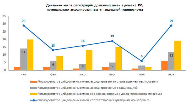 Большая часть июньских доменов, как и в мае, содержат название вируса, но их число значительно увеличилось: 124 в домене .RU и 19 - в .РФ (в мае таких доменов было 80 и 2, соответственно). Как говорилось выше, резко выросло число регистраций доменов, связанных с темой вакцинации или включающих названия вакцин против вируса на кириллице или латинице - 43 доменных имени в .RU и 12 в .РФ (33 и 3 в мае). Еще 20 доменов (14 в .RU и 6 в .РФ) ассоциированы с проведением различных covid-тестирований (например, на наличие вируса или, наоборот, антител к нему).