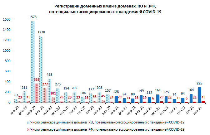 Всего же с начала 2021 года (с января по ноябрь) в список доменных имен, содержащих слова «сorona», «covid», «pandemia», «ковид», «пандемия», «вакцина» и другие, было добавлено 1669 доменов: 1466 в .RU и 203 в .РФ.