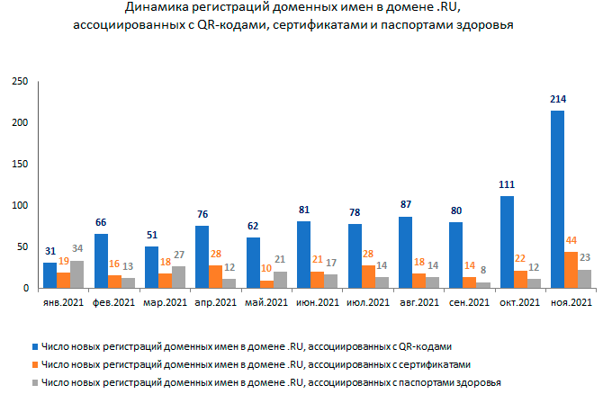 В течение первых 10 месяцев 2021 года количество регистрируемых ежемесячно таких доменных имен колебалось около цифры 100. На число регистраций не повлияло первое объявление о введение QR-кодов для посещения различных мест в июле этого года. А вот меры, введенные в ноябре, когда в ряде регионов России QR-код потребовался для пользования общественным транспортом, «простимулировали» рост регистраций доменных имен, ассоциированных с QR-кодами, сертификатам и паспортами здоровья. Рост регистраций в конце осени составил более 90%: от 145 упоминаний контрольных слов в октябре, до 281 в ноябре.