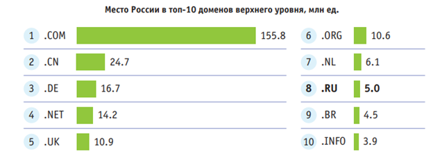 В докладе отмечается, что на российском рынке доменных имен наблюдается устойчивый спрос на национальные домены верхнего уровня, а домен .RU сохраняет тенденцию к росту, занимая восьмое место в десятке самых популярных доменов верхнего уровня.