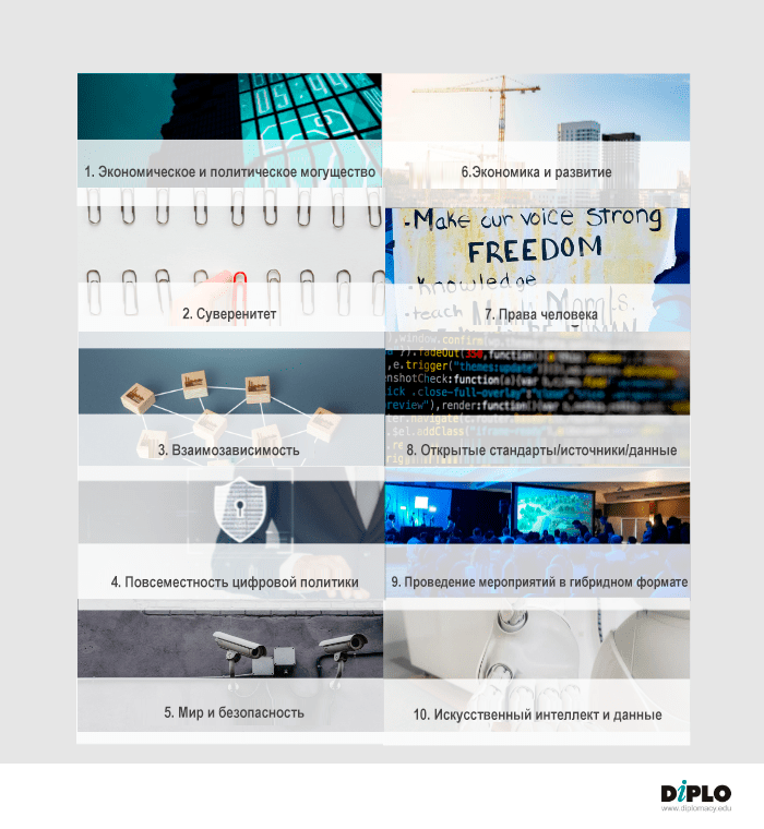 В статье рассказывается о том, какое влияние оказывают друг на друга цифровое управление и дипломатия, и какие тенденции сегодня можно выделить применительно к ним. Йован Курбалийя перечисляет десять тенденций по трем основным направлениям: цифровая геополитика и геоэкономика, появление в дипломатической повестке новых тем, связанных с цифровыми технологиями, и освоение новых инструментов дипломатии. По каждой из названных тенденций автор дает краткие прогнозы, рассказывает о событиях, связанных с выделенными тенденциями, а также анализирует государственную и международную политику по каждой из них.
