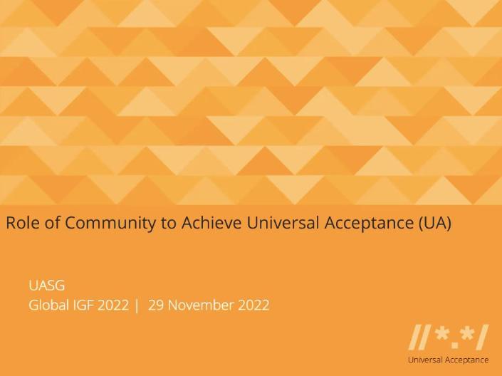 29 ноября на Глобальном форуме по управлению интернетом IGF 2022 прошла секция «Role of Community to Achieve Universal Acceptance», посвящённая универсальному принятию. В обсуждении приняли участие представители технического сообщества и гражданского общества из стран Азии, Африки и Восточной Европы – руководители и эксперты групп по универсальному принятию: Реймонд Мамата, Аджай Дата, Хадия Эльмияви, Анил Кумар Джайн, Сатиш Бабу, Дессален Мекуанинт Йехуала и Мария Колесникова. В ходе секции они обсудили роль локальных, технических и академических сообществ, а также государства и бизнеса в достижении универсального принятия.