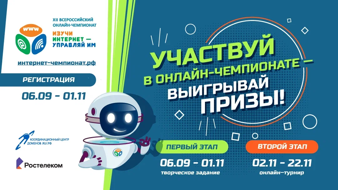 Координационный центр доменов .RU/.РФ и Ростелеком объявляют о старте XII Всероссийского онлайн-чемпионата «Изучи интернет – управляй им!». Это соревнования по цифровой грамотности для школьников и студентов до 18 лет. Регистрация на Чемпионат продлится до 1 ноября 2023 года. Тема года – технологии в образовании.