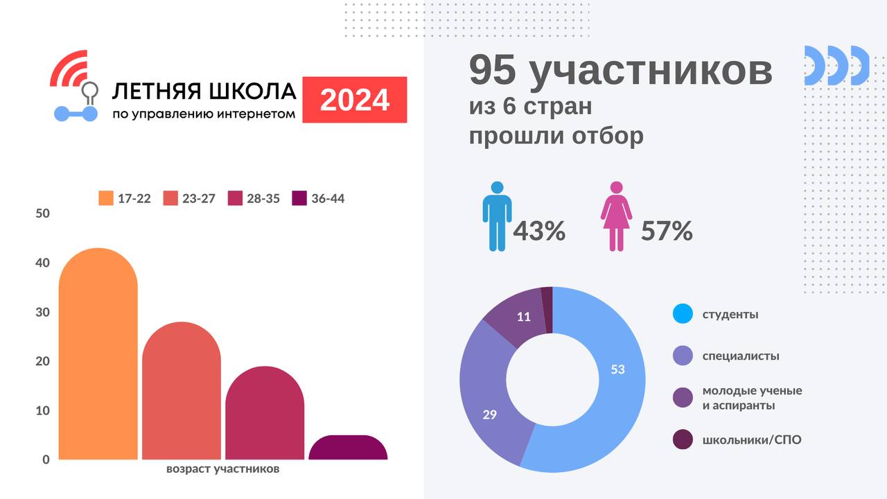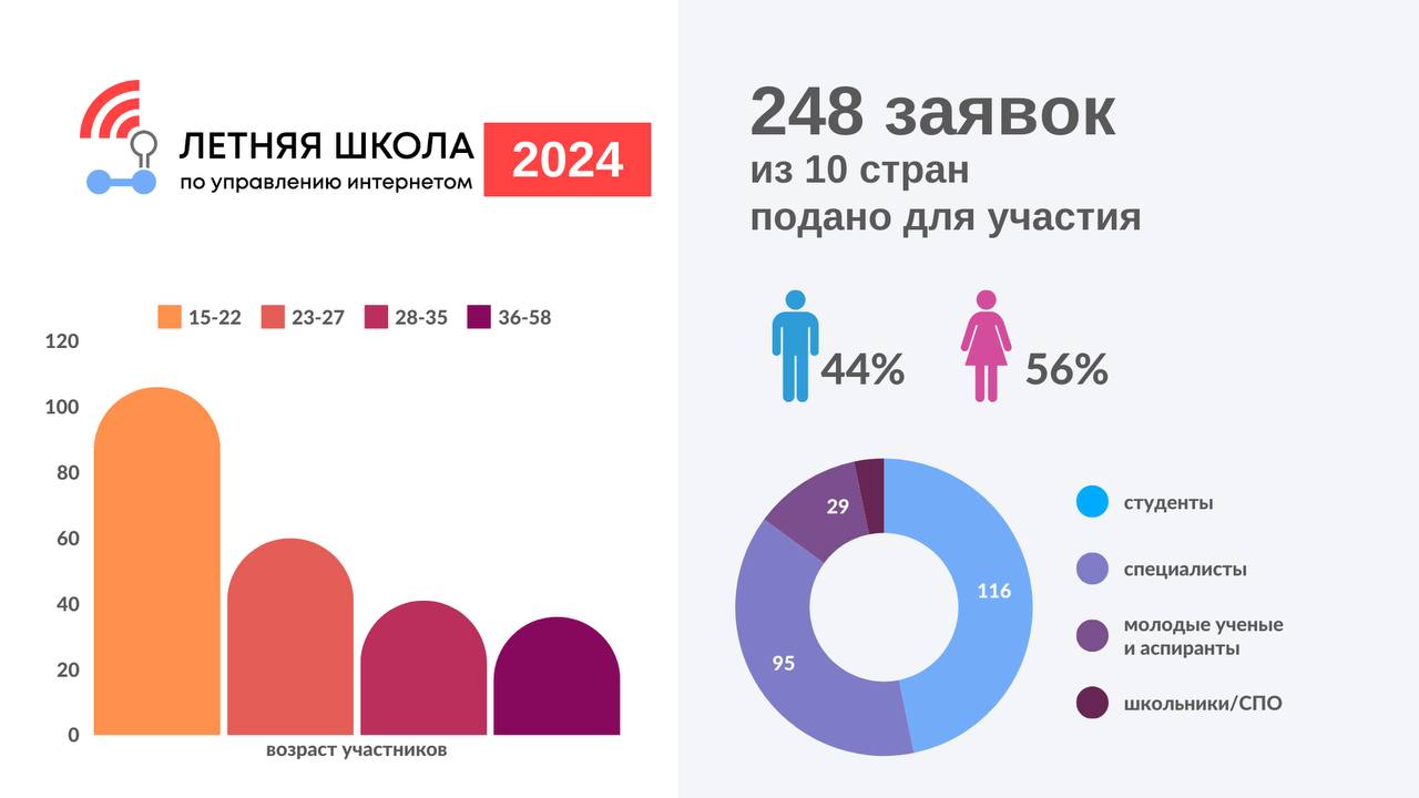 Заявки на участие в Летней школе по управлению интернетом поступили из 10 стран: Армении, Беларуси, Индии, Казахстана, Китая, Кыргызстана, России, Таджикистана, Туркменистана и Узбекистана. Особенно много заявок было от молодых специалистов, уже окончивших вузы и работающих в различных профессиональных сферах.