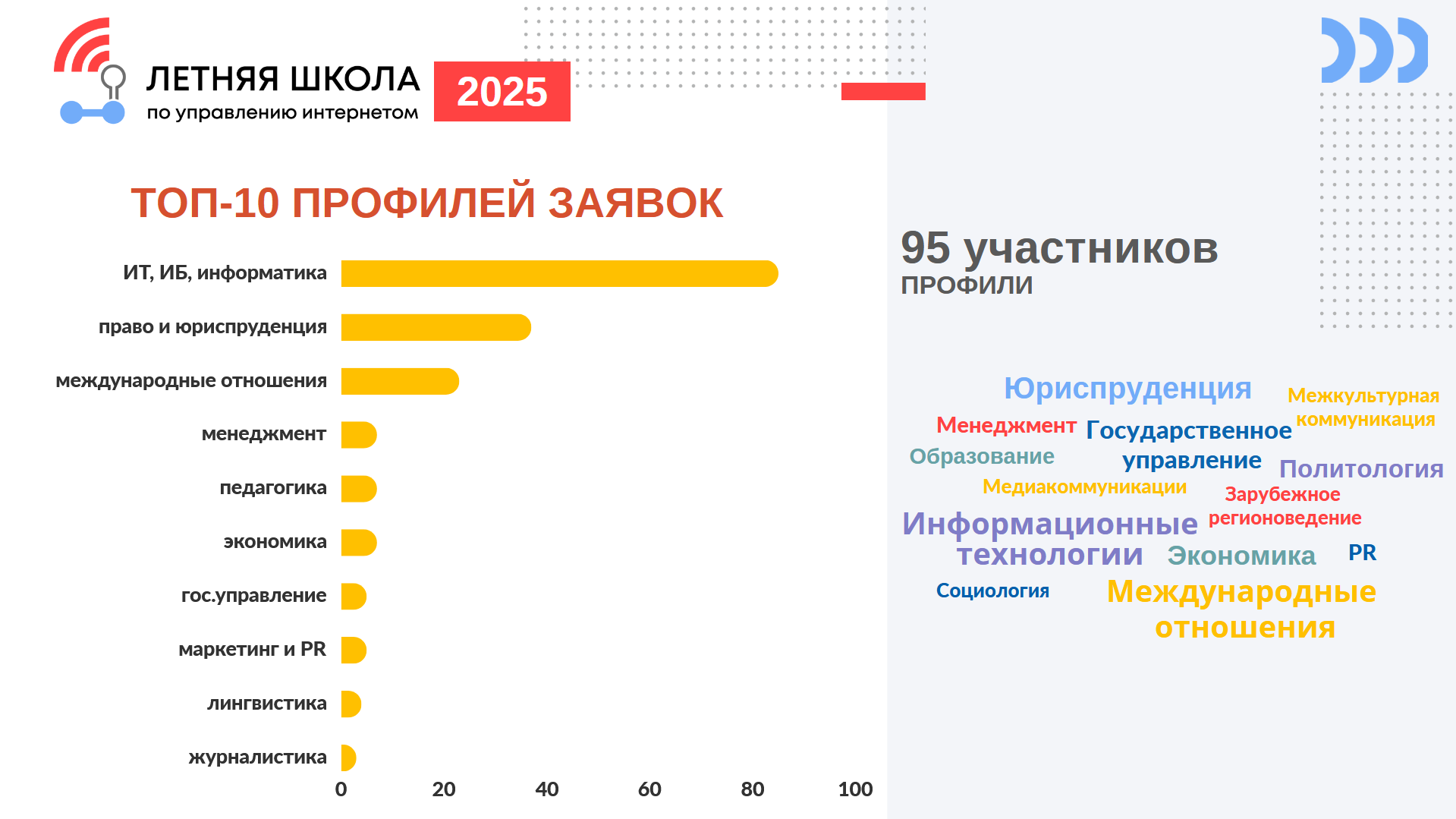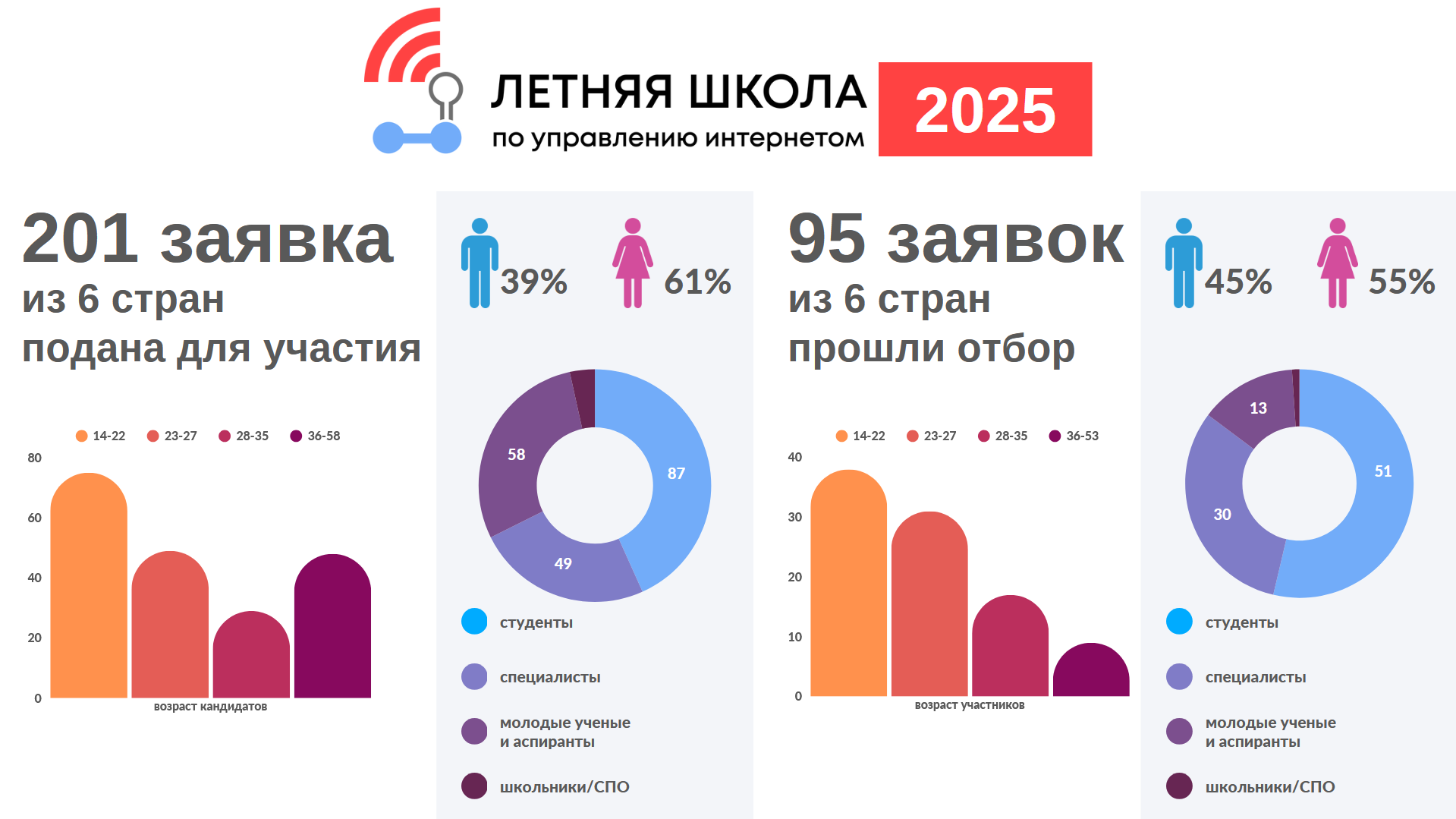 После многоэтапного отбора в Летнюю школу прошли 95 человек, а всего на конкурс поступила 201 заявка – этот показатель немного ниже рекордных цифр последних двух лет, но остается выше уровня первых потоков Школы и подтверждает стабильный интерес к тематике управления интернетом среди молодежи. При этом конкуренция за место в группе осталась сопоставимой с наборами 2023 и 2024 годов.